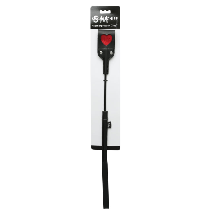 Feel the love with the Sex & Mischief Heart Crop. With the heart cut-out, you're sure to leave your love note on your partner's skin. The black wand is complete with a black wrist strap. Hardware is nickel-free.