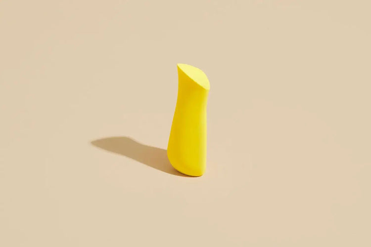 Kip lemon lipstick vibe, a cute yellow vibe that fits in your hand stands upright on a tan background