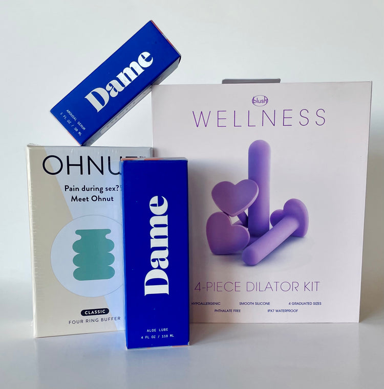 The Penetration Relief Kit was designed to help vulva owners find relief from pelvic and penetrative pain. Complete with everything you need to increase vaginal suppleness, reduce discomfort with penetrative sex (with a penis or a dildo), and get things excited and lubed up- this kit is here to help make penetration fun again.